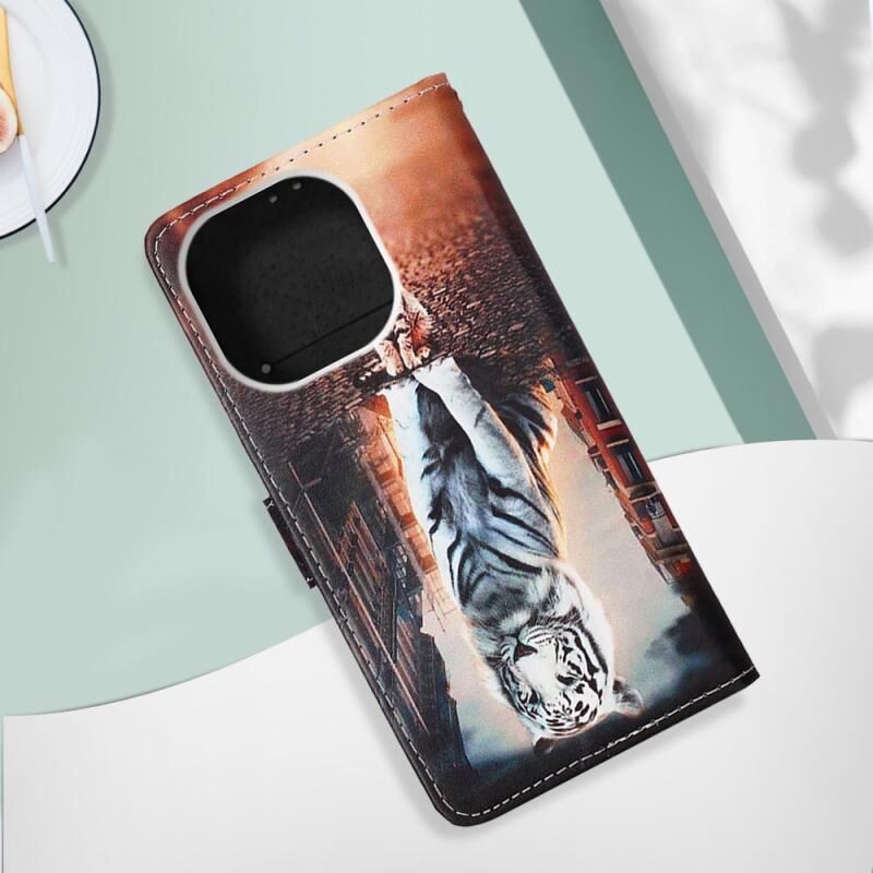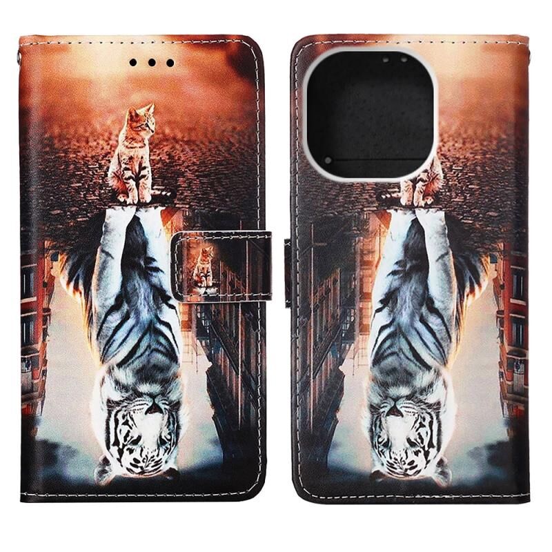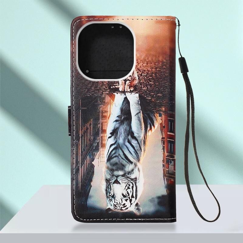 Θήκη για iPhone 14 Pro με ζωγραφισμένη επίπεδη υφή δέρματος, λουρί, θήκη για κάρτες, πορτοφόλι και στήριξη (Γάτα και Τίγρης)