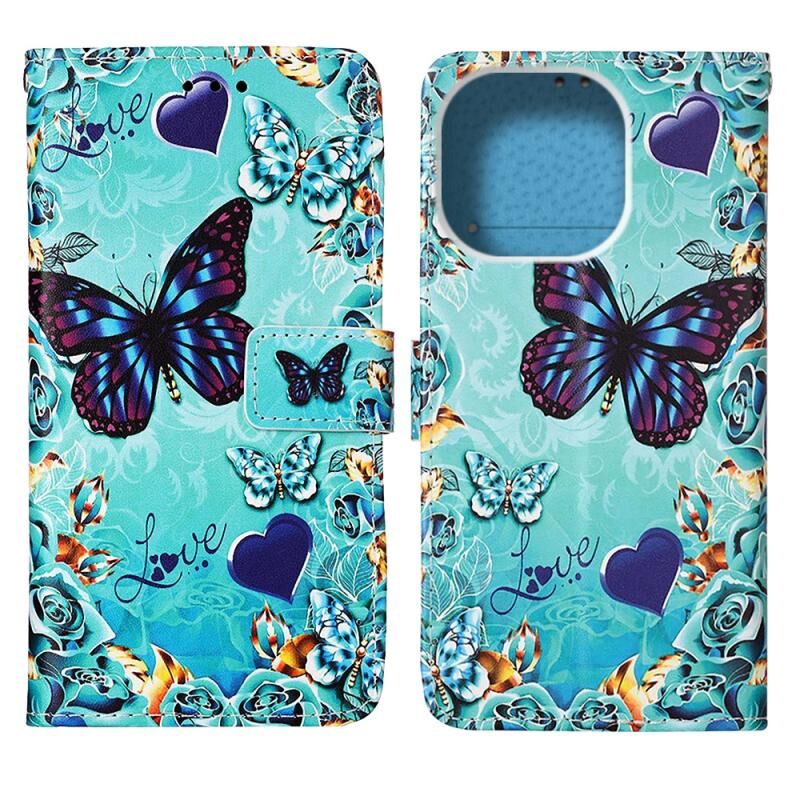 Θήκη για iPhone 14 Pro με ζωγραφισμένη επίπεδη υφή δέρματος, λουρί, θήκη για κάρτες, πορτοφόλι και στήριξη (Αγάπη Πεταλούδα)