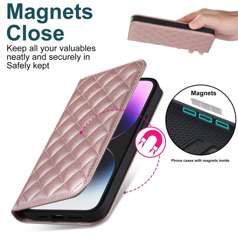 For iPhone 14 Pro Rhombic MagSafe RFID Anti-Theft Wallet Leather Phone Case(Rose Gold)