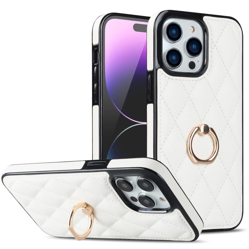 For iPhone 14 Pro Rhombic PU Leather Phone Case with Ring Holder(White)