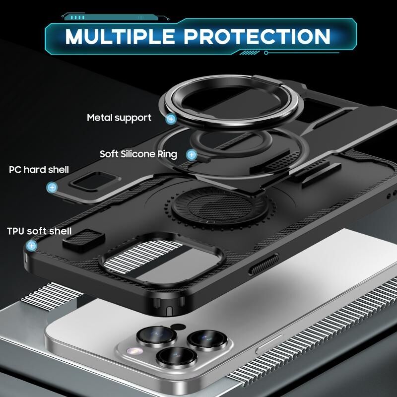 3. Δακτύλιος Σιλικόνης και Βάση: Δεν παρέχει μόνο βασική προστασία, αλλά η θήκη λειτουργεί και ως λαβή για να κρατάτε σταθερά το τηλέφωνό σας. Και ως βάση τηλεφώνου που επιτρέπει την κατακόρυφη ή οριζόντια λειτουργία σε πολλαπλές γωνίες.