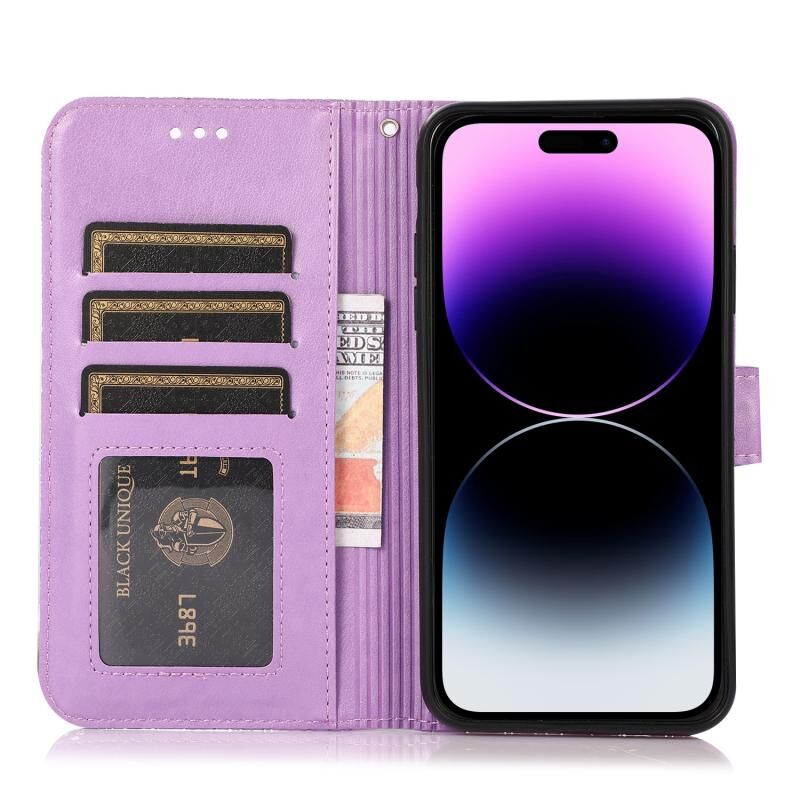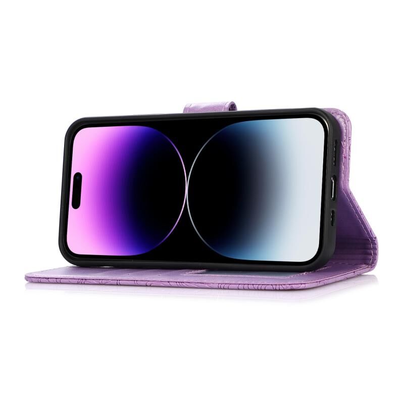Θήκη δέρματος οριζόντια για iPhone 14 Pro με ανάγλυφο ηλιοτρόπιο και αίσθηση δέρματος (Μωβ)