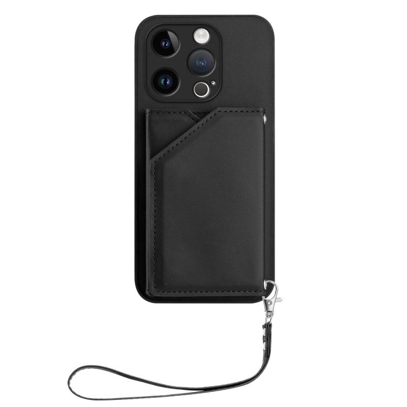 For iPhone 14 Pro Skin Feel Four Card Slots Phone Case with Wrist Strap(Black)