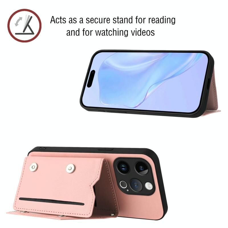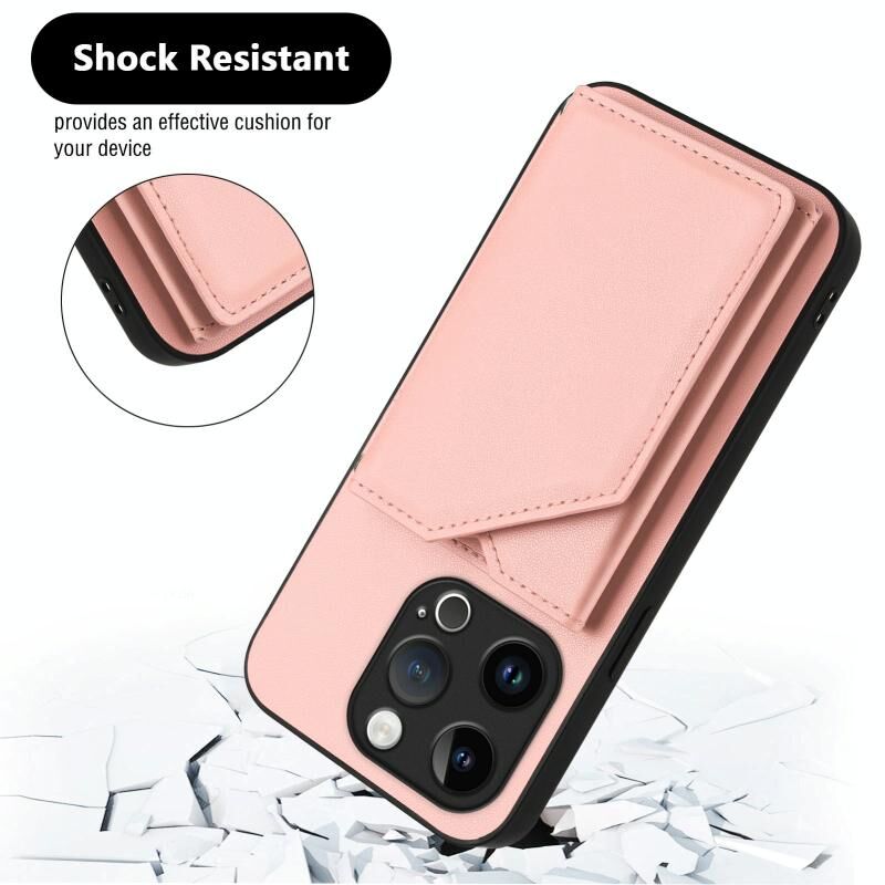 Θήκη τηλεφώνου για iPhone 14 Pro με αίσθηση δέρματος, τέσσερις θήκες για κάρτες και λουρί καρπού (Ροζ)