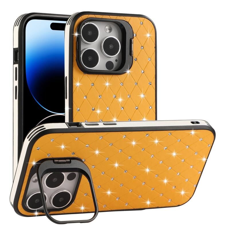 For iPhone 14 Pro Starry Bling Diamonds Lens Holder Phone Case(Orange)