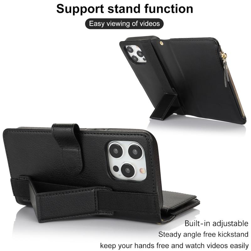 For iPhone 14 Pro Wristband Holder Zipper Purse RFID Leather Phone Case(Black)