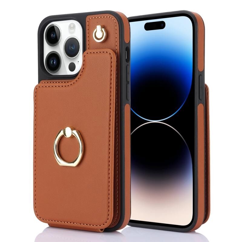 For iPhone 14 Pro YM005 Skin Feel Card Bag Phone Case with Long Lanyard(Brown)