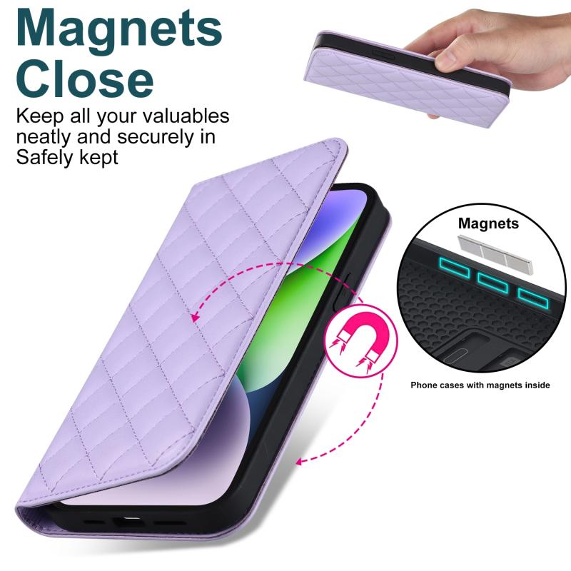 For iPhone 14 Rhombic MagSafe RFID Anti-Theft Wallet Leather Phone Case(Purple)