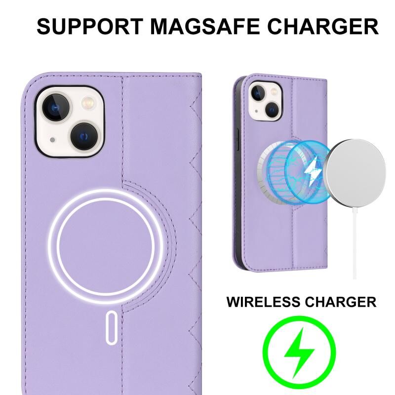 Θήκη τηλεφώνου δερμάτινη με προστασία RFID και MagSafe για iPhone 14, σε λευκό χρώμα, με ρόμβους.