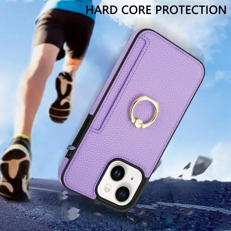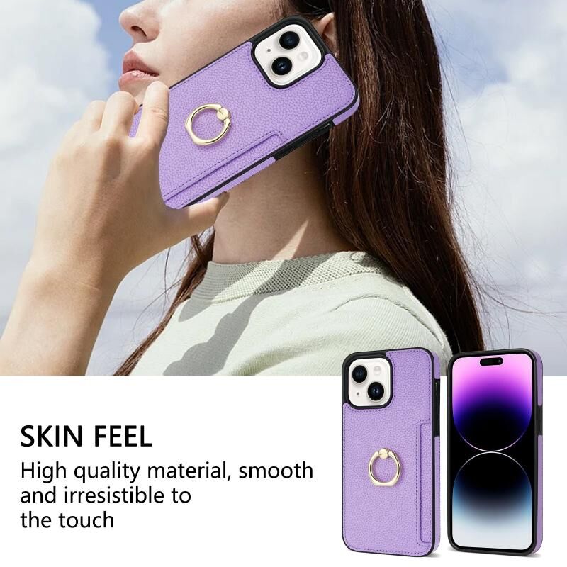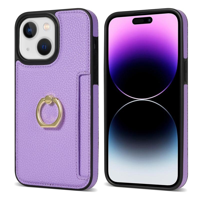Θήκη iPhone 14 με Δαχτυλίδι & Κάρτες, Δερμάτινη Litchi (Μωβ)