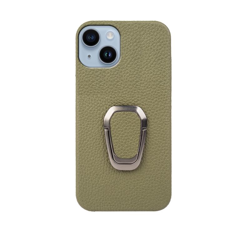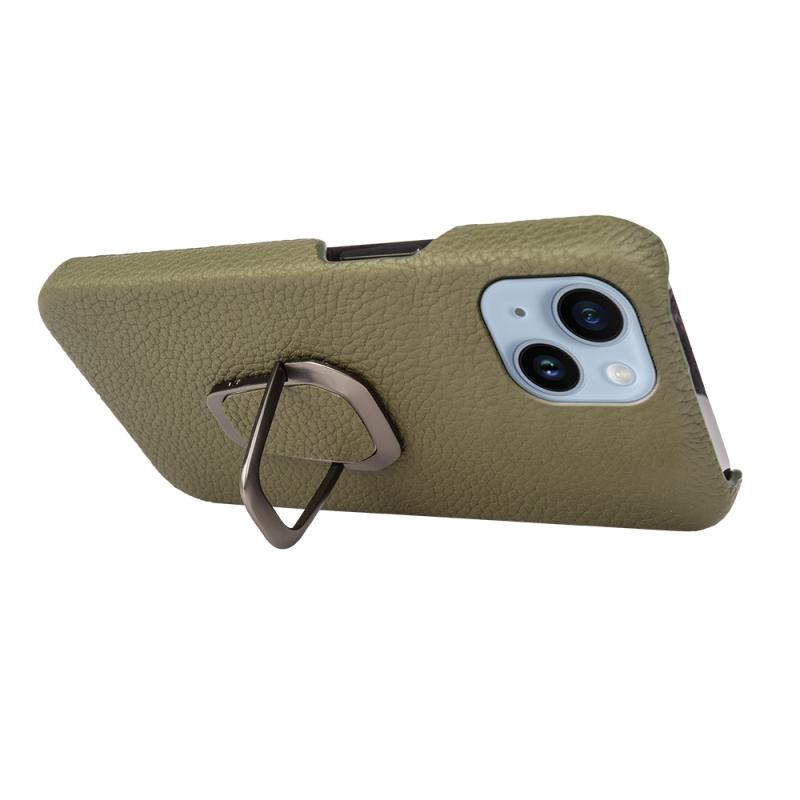 For iPhone 14 Ring Holder Litchi Texture Genuine Leather Phone Case(Green)