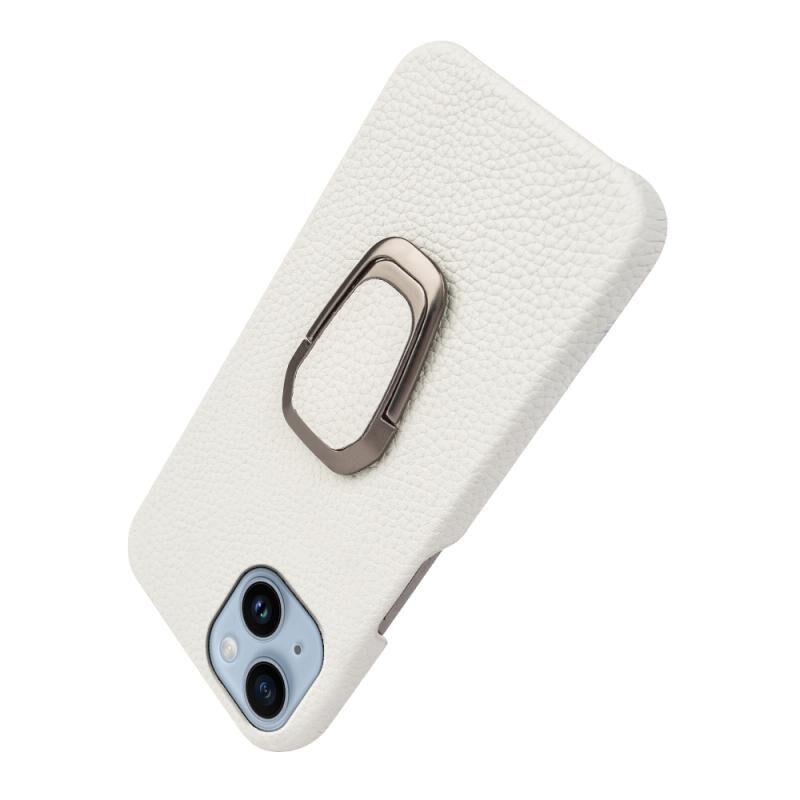 For iPhone 14 Ring Holder Litchi Texture Genuine Leather Phone Case(White)