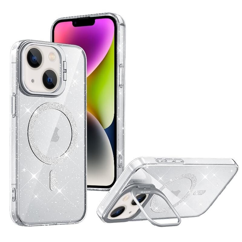 For iPhone 14 Shiny Shield MagSafe Lens Holder Phone Case(Silver)