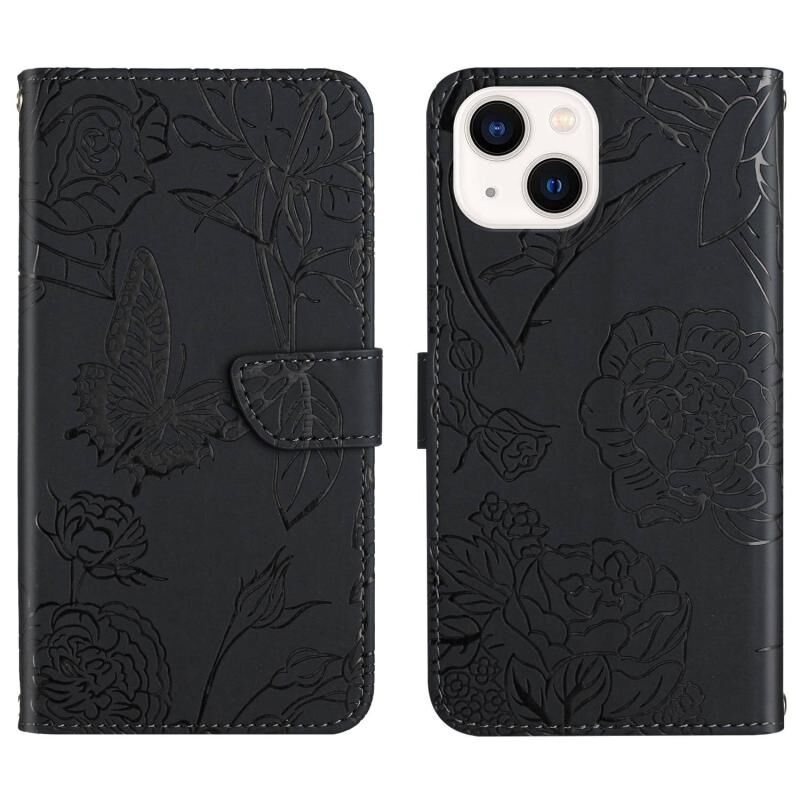 Θήκη τηλεφώνου από ανάγλυφο δέρμα για iPhone 14, αίσθηση δέρματος, με σχέδιο πεταλούδας και παιώνιας (Κόκκινο)