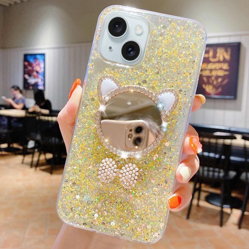 For iPhone 14 Starry Sequin Diamond Cat Ears Mirror Epoxy TPU Phone Case(Yellow)