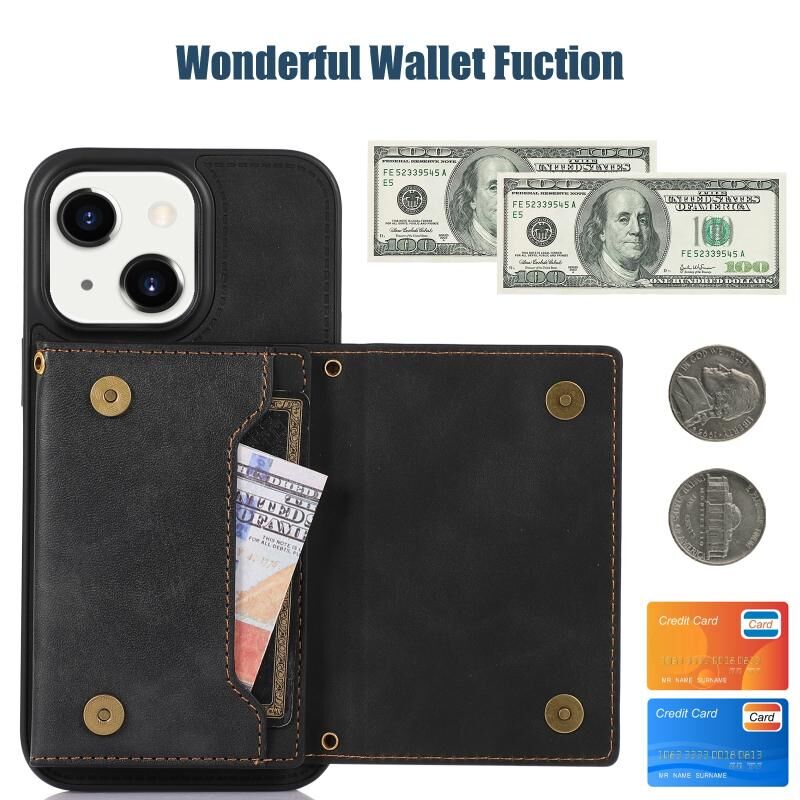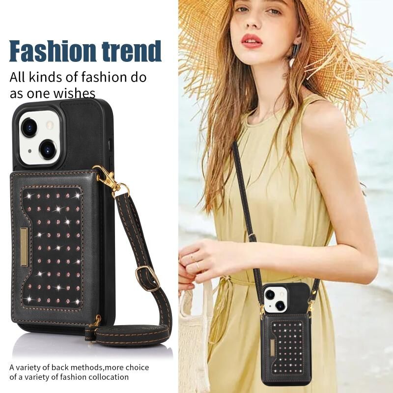 Θήκη τηλεφώνου από δέρμα με τριπλή προστασία RFID για iPhone 14 με κορδόνι (Μαύρο)