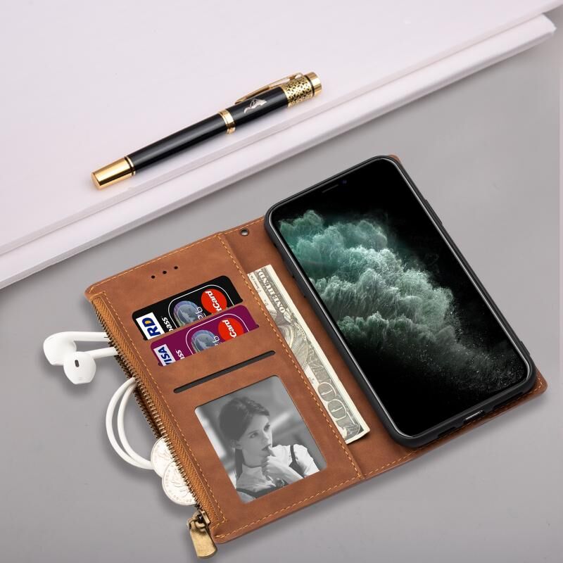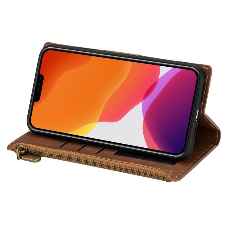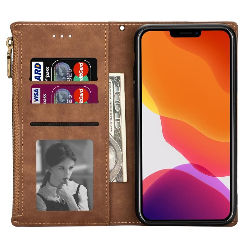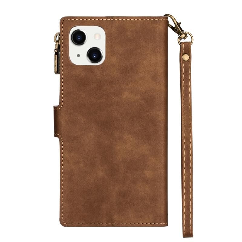 Θήκη δέρματος οριζόντιας αναδίπλωσης με φερμουάρ και πολλαπλές θήκες καρτών για iPhone 14 (Χρυσορόδινο)