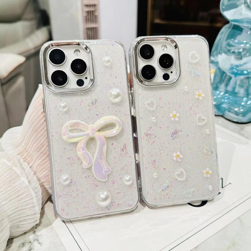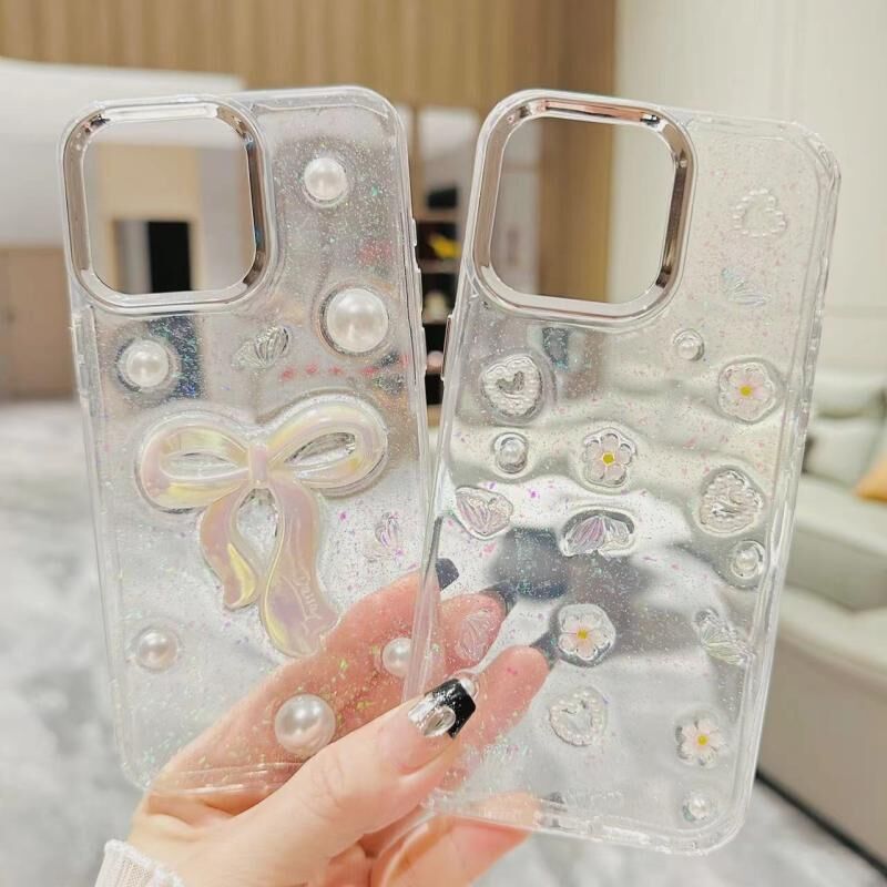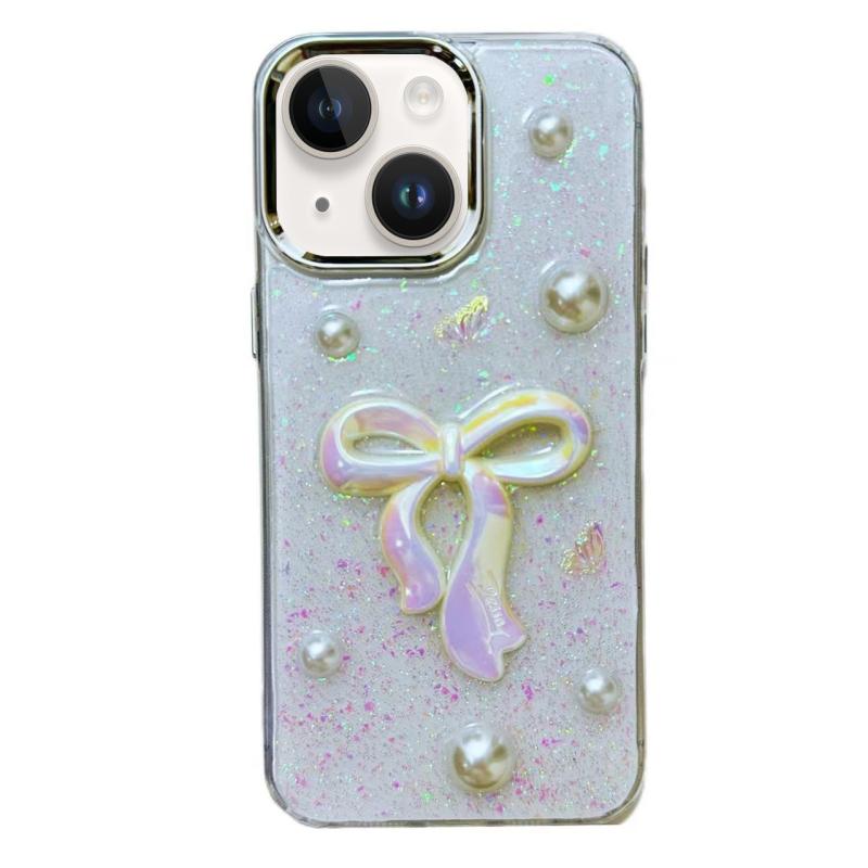 Θήκη τηλεφώνου TPU για iPhone 15 3D με φιόγκο, πέρλες, λουλούδια και σχέδιο καρδιάς (Φιόγκος με πέρλες)
