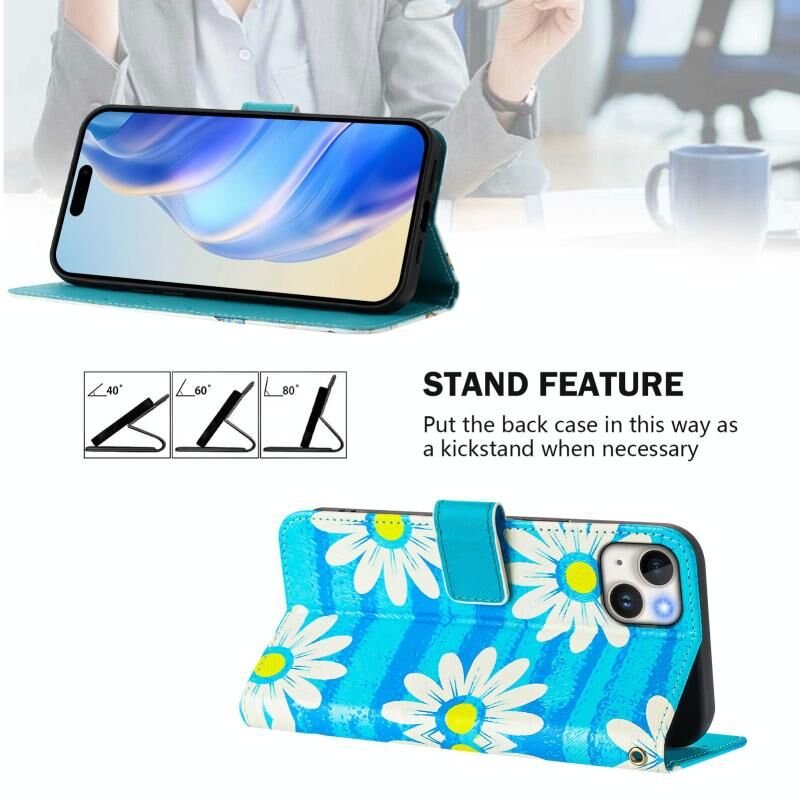 For iPhone 15 Art Colored Drawing Pattern Leather Phone Case(Blue daisy)