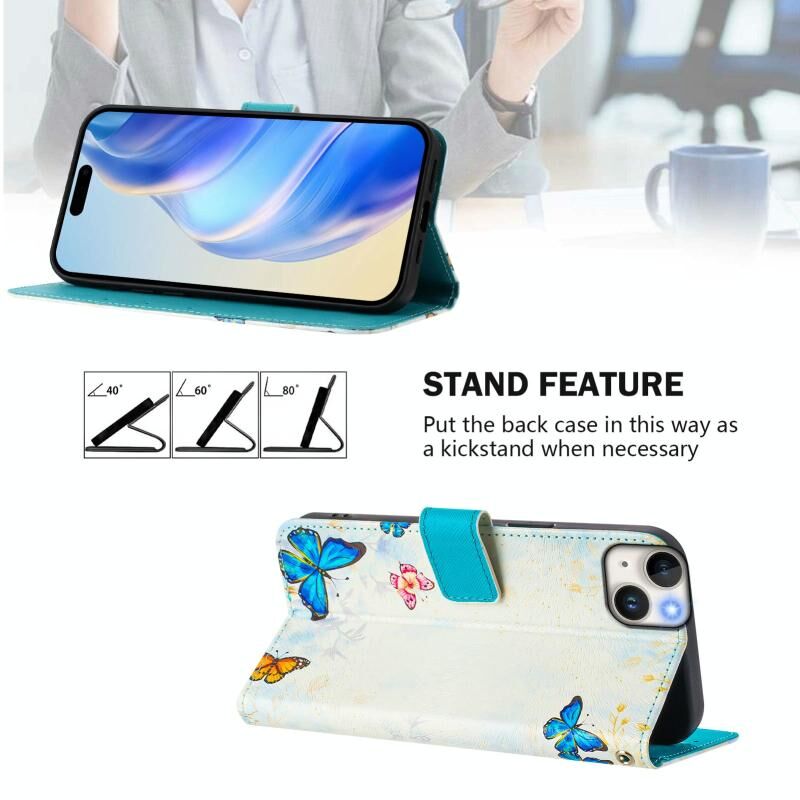 For iPhone 15 Art Colored Drawing Pattern Leather Phone Case(Butterfly house)
