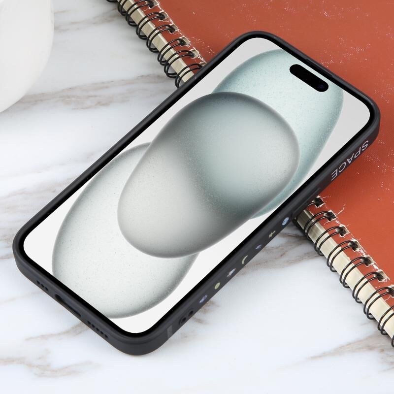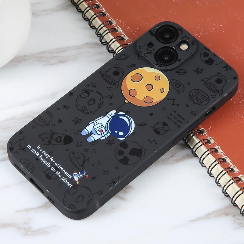 Θήκη τηλεφώνου για iPhone 15, σιλικόνης, με σχέδιο αστροναύτη και ευθείες άκρες (Προσσελήνωση Πλανήτη - Μαύρο)