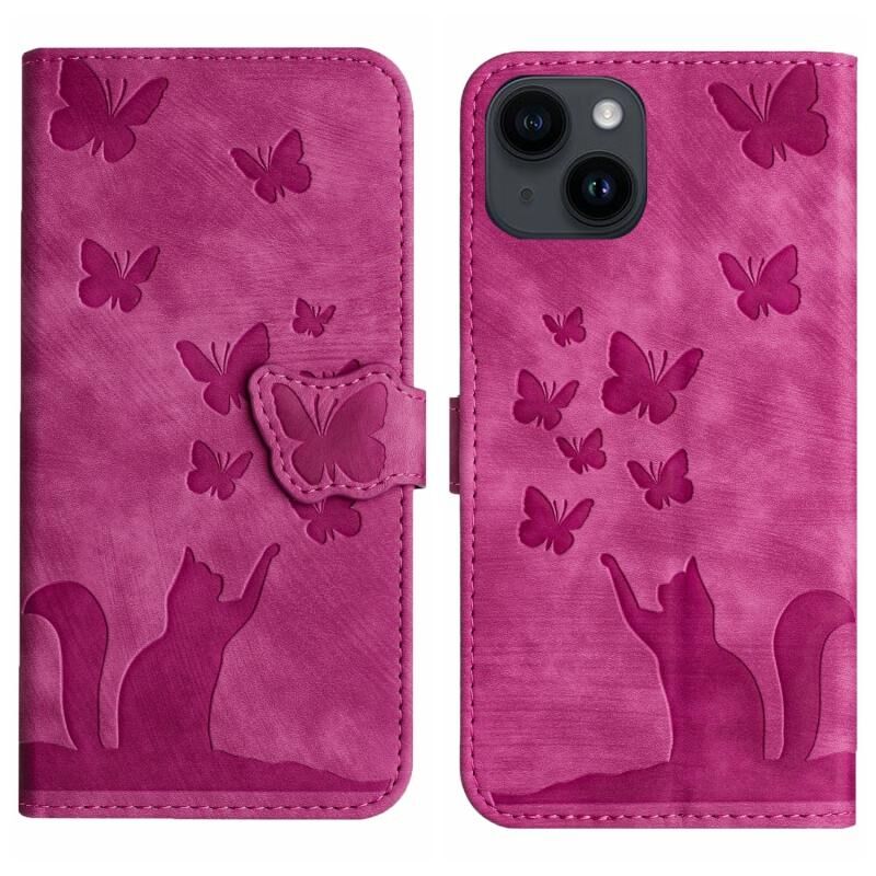 Θήκη τηλεφώνου από δέρμα με ανάγλυφο σχέδιο πεταλούδας και γάτας για iPhone 15 (Μωβ)