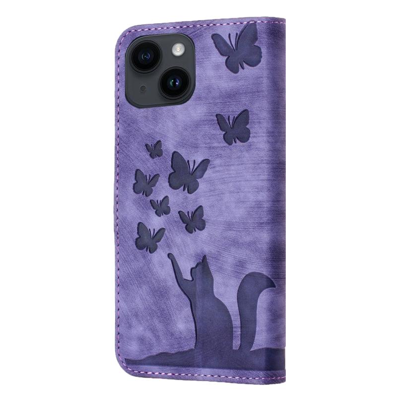 For iPhone 15 Butterfly Cat Embossing Flip Leather Phone Case(Purple)