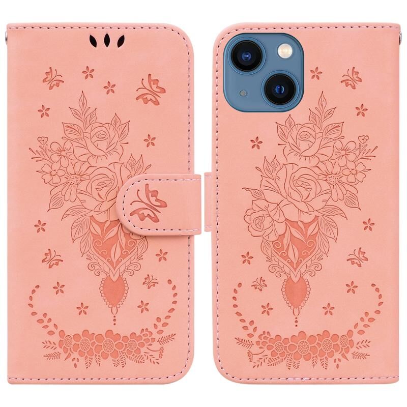 Θήκη τηλεφώνου από δέρμα με ανάγλυφο σχέδιο πεταλούδας και τριαντάφυλλου για iPhone 15 (Ροζ)