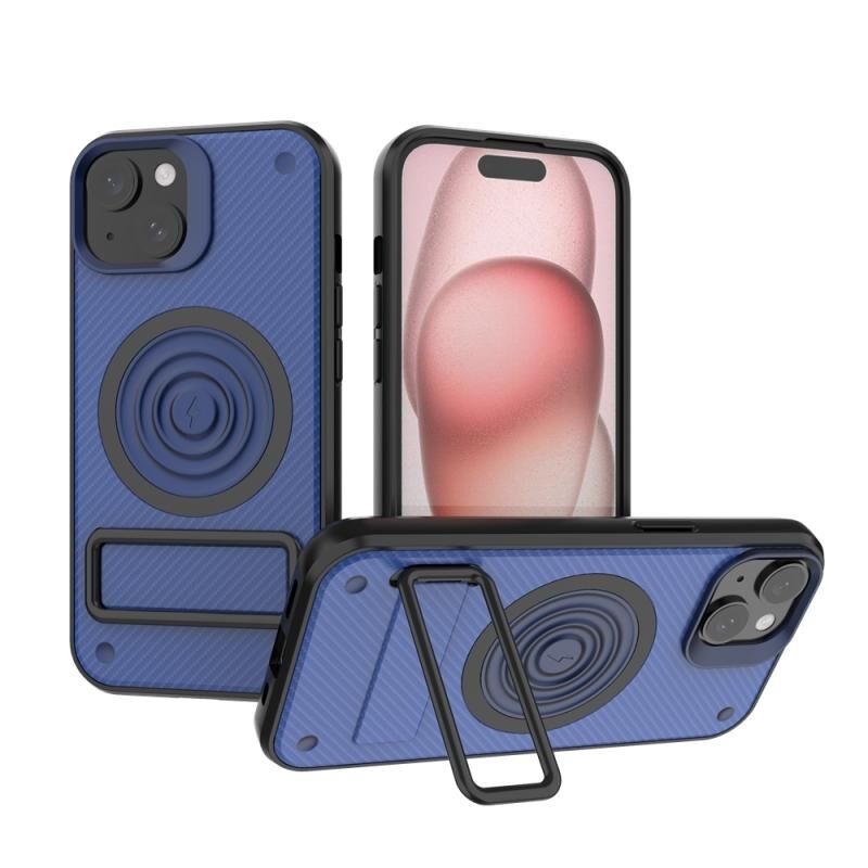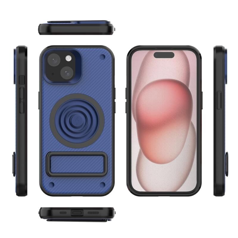 For iPhone 15 Carbon Fiber Texture PC + TPU Phone Case with Metal Holder(Blue)