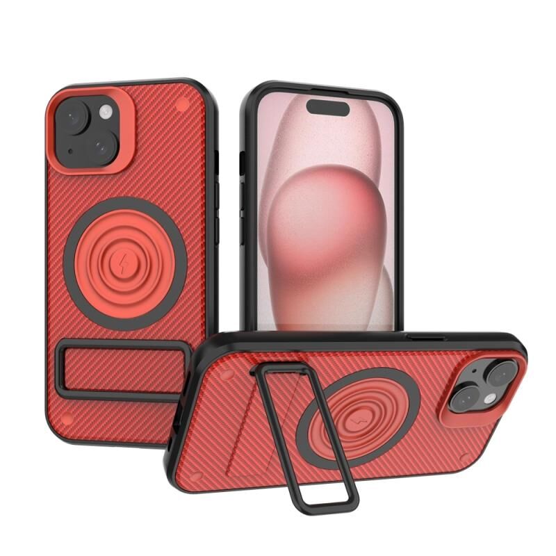 For iPhone 15 Carbon Fiber Texture PC + TPU Phone Case with Metal Holder(Red)