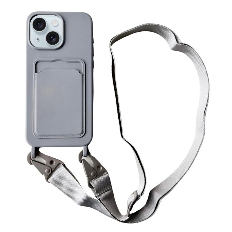 For iPhone 15 Card Slot Liquid Silicone Phone Case with Lanyard(Grey)