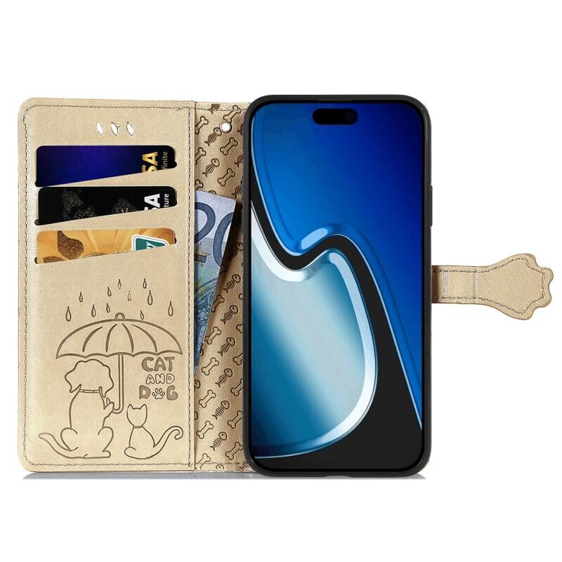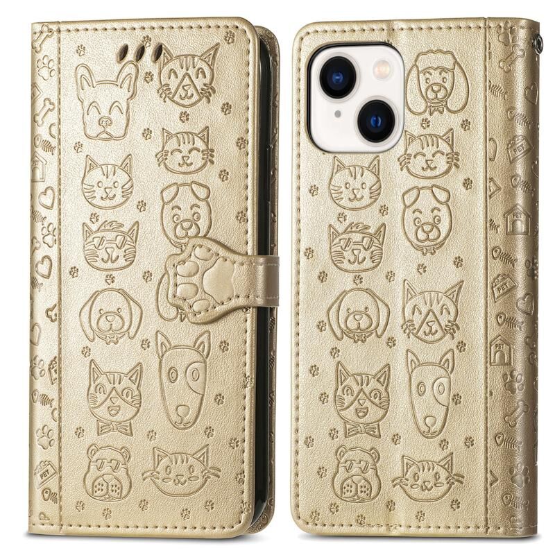For iPhone 15 Cat and Dog Embossed Leather Phone Case(Gold)