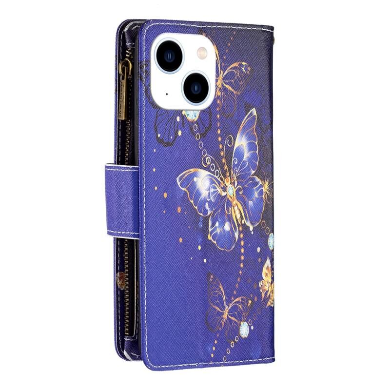 Θήκη δερμάτινη για iPhone 15 με σχέδιο ζωγραφικής και φερμουάρ (Μωβ Πεταλούδα)