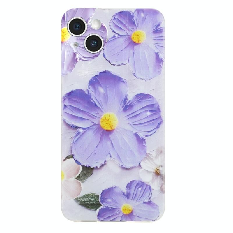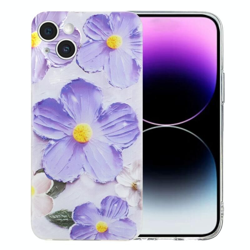 Θήκη τηλεφώνου TPU με πολύχρωμο σχέδιο ζωγραφικής για iPhone 15 (Μωβ Λουλούδια)