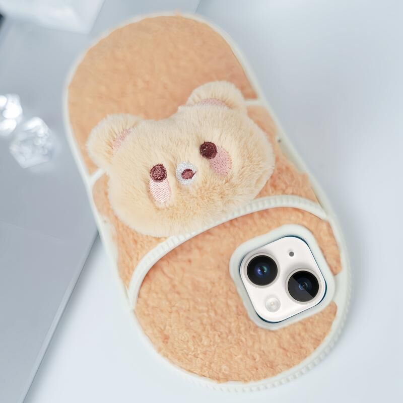 Θήκη τηλεφώνου TPU για iPhone 15 με σχέδιο βελούδινης κούκλας και παντόφλας (Γκρίζλι Αρκούδα)