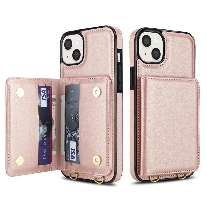 Θήκη τηλεφώνου από δέρμα για iPhone 15, τύπου τσάντας με διπλή αγκράφα και προστασία RFID (Ροζ χρυσός)
