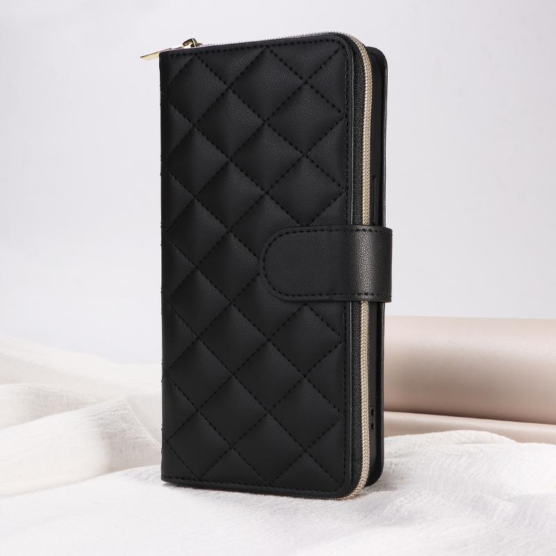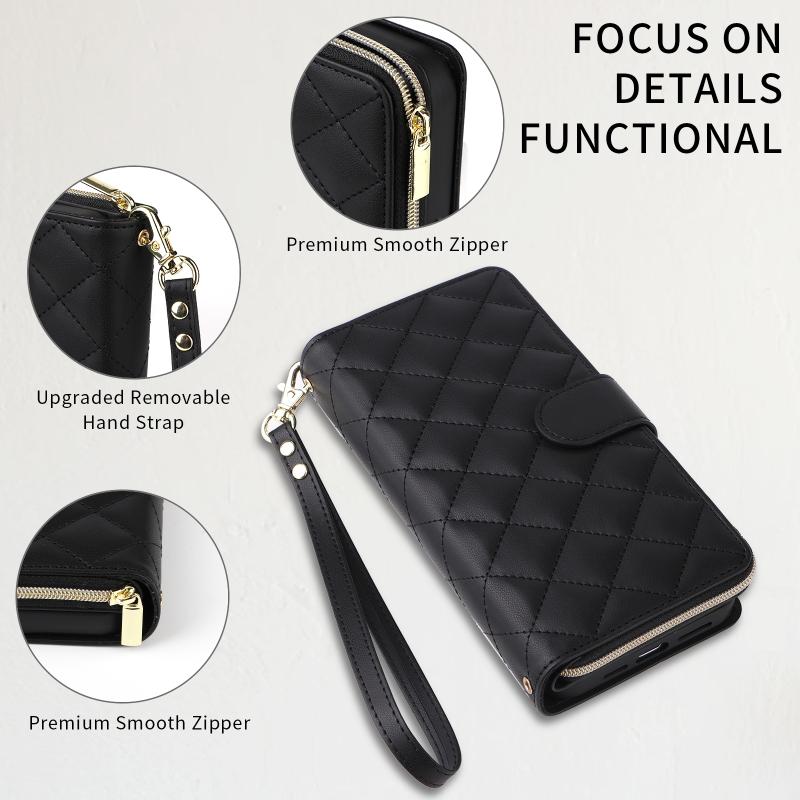 For iPhone 15 Crossbody Rhombic Zipper Tower Buckle Leather Phone Case with Lanyard(Black)