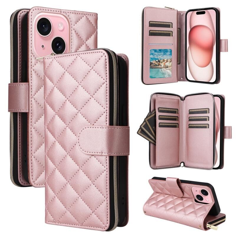 Θήκη τηλεφώνου για iPhone 15, χιαστί, με ρομβικό φερμουάρ, αγκράφα πύργου και δερμάτινη κατασκευή, με κορδόνι (Μωβ)