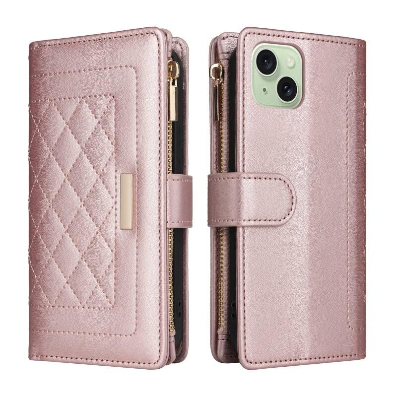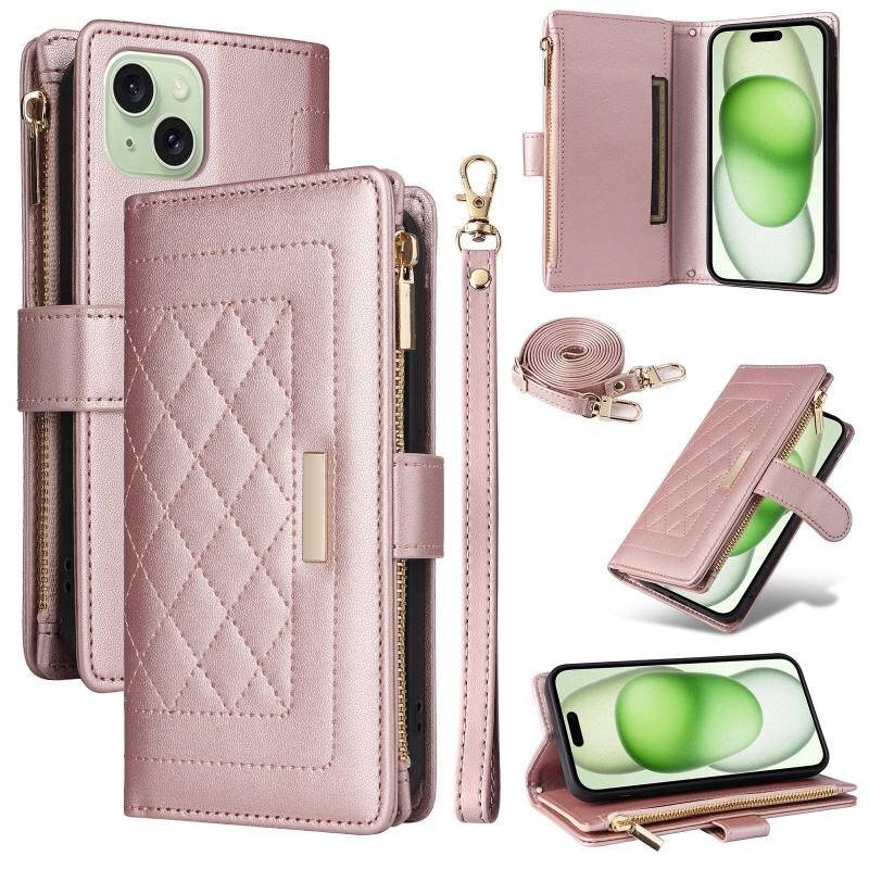 Θήκη τηλεφώνου για iPhone 15, δερμάτινη με φερμουάρ και σχέδιο ρόμβου, σε ροζ χρυσό. (Ροζ χρυσός)