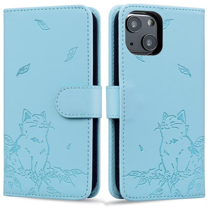 For iPhone 15 Cute Cat Embossed Leather Phone Case(Sky Blue)