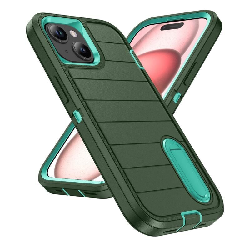 Θήκη κινητού τηλεφώνου iPhone 15 Defender Gen2, ανθεκτική από πολυανθρακικό + σιλικόνη με βάση στήριξης (Σκούρο Μπλε + Κυανό)