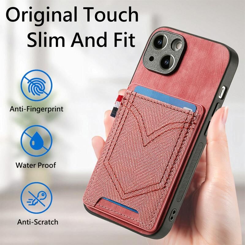 Θήκη τηλεφώνου από δέρμα με υφή τζιν για iPhone 15 με θήκη για κάρτες (Μαύρο)