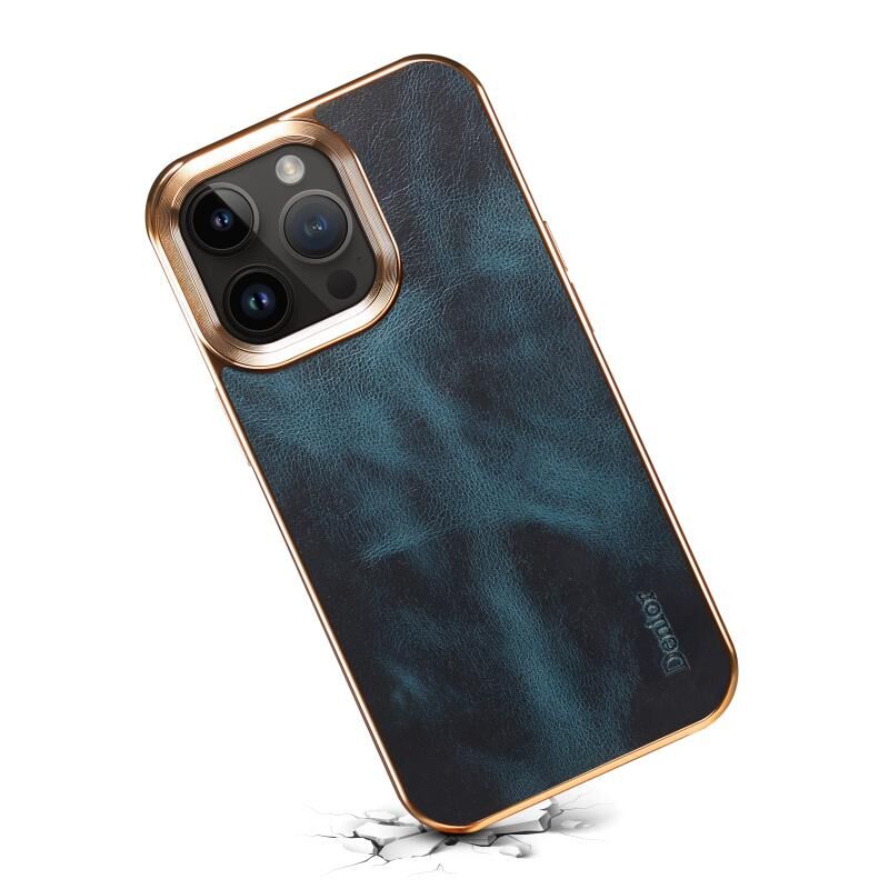 Θήκη τηλεφώνου για iPhone 15 Denior, από δέρμα αγελάδας με κερί λαδιού και επιμετάλλωση (Καφέ) (Μπλε)