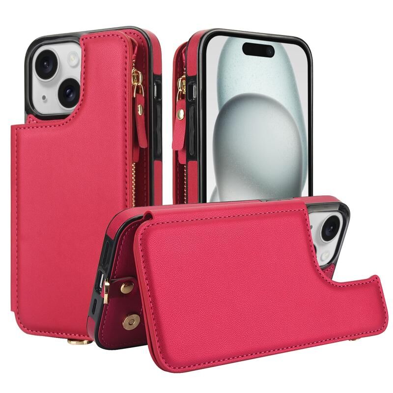 For iPhone 15 Double Flap Zipper RFID Leather Phone Case with Short Lanyard(Red)