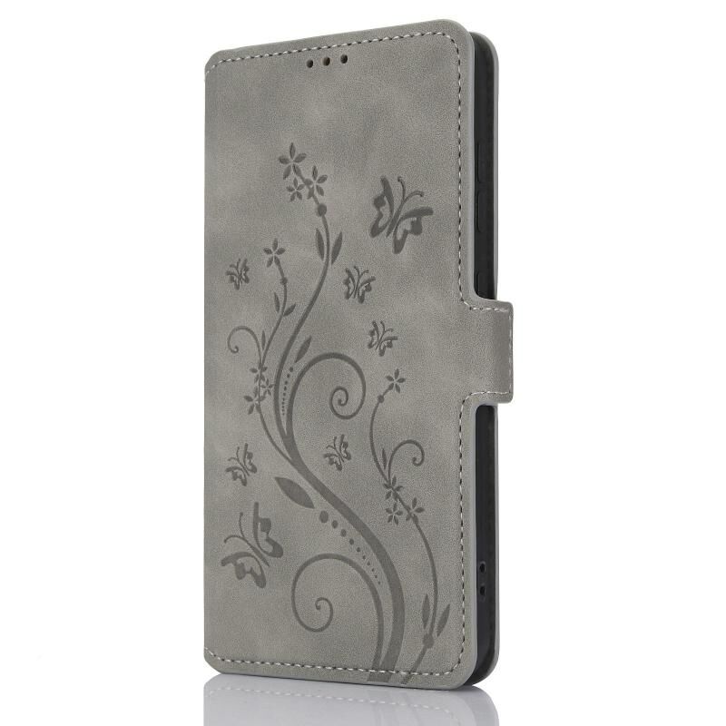 Θήκη τηλεφώνου από δέρμα με ανάγλυφο σχέδιο πεταλούδας, λουλουδιών και ονείρων για iPhone 15 (Γκρι)