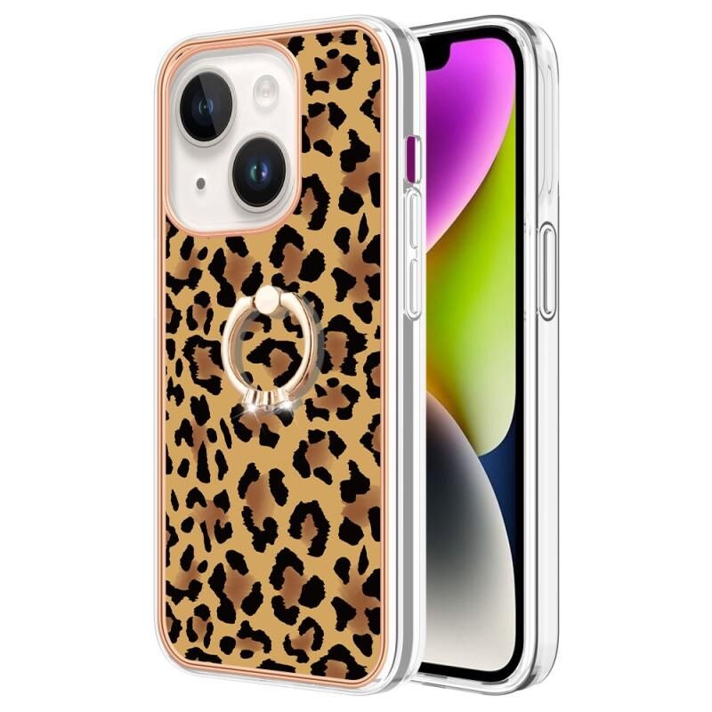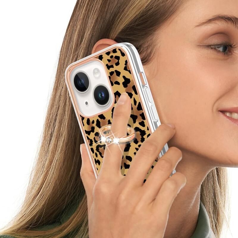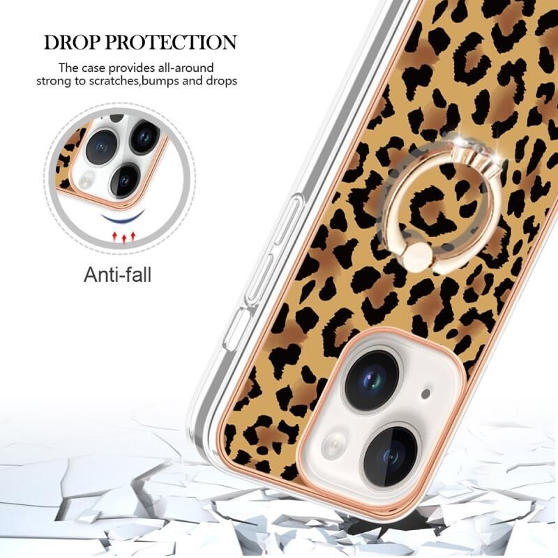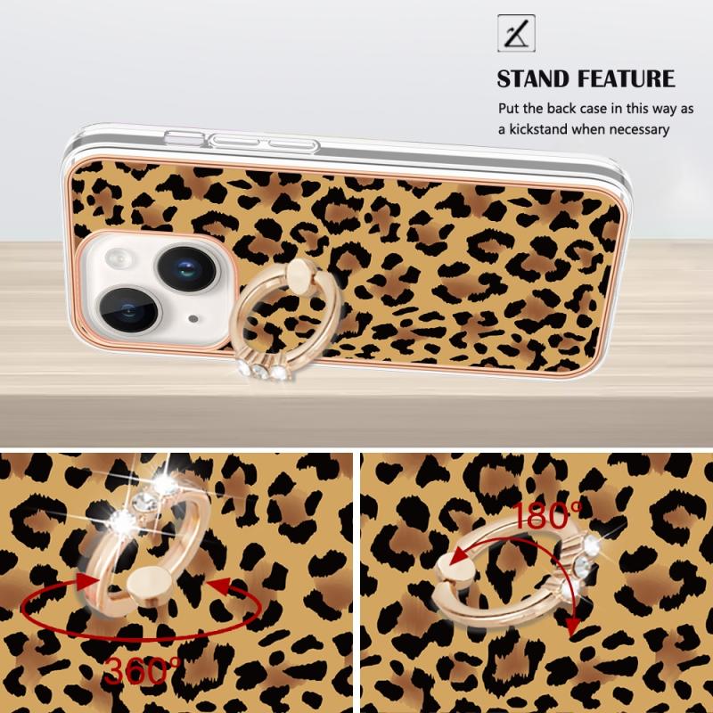 For iPhone 15 Electroplating Dual-side IMD Phone Case with Ring Holder(Leopard Print)