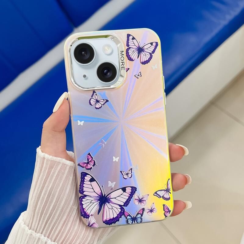 Θήκη τηλεφώνου με ηλεκτρολυτική επίστρωση και σχέδιο laser πεταλούδας για iPhone 15 (Λευκές-Μωβ Πεταλούδες AB6)