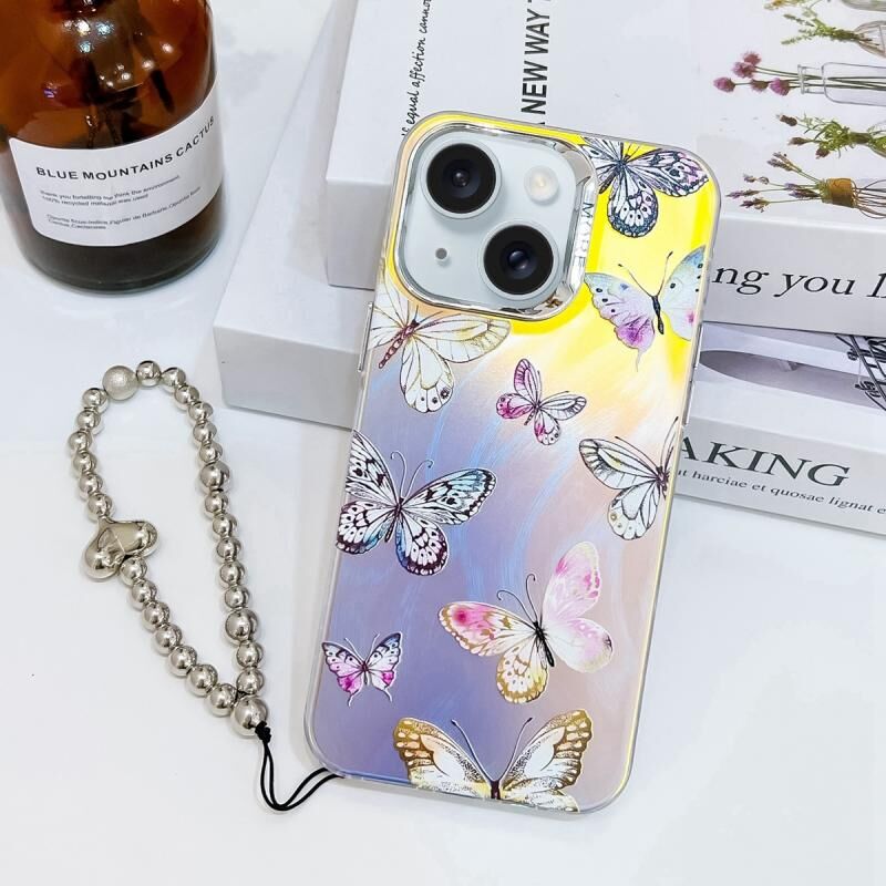 Θήκη τηλεφώνου με ηλεκτρολυτική επίστρωση και σχέδιο πεταλούδας laser για iPhone 15 με λουρί καρπού (Ροζ Πεταλούδες AB2)