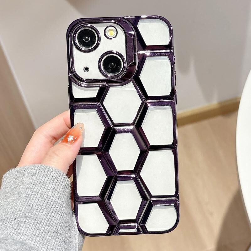 For iPhone 15 Electroplating Laser Engraving 3D Honeycomb Clear TPU Phone Case(Purple)