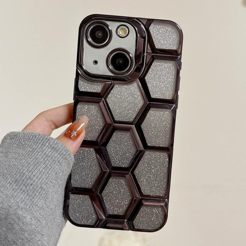 For iPhone 15 Electroplating Laser Engraving 3D Honeycomb Glitter TPU Phone Case(Black)